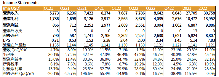 1.FY2022Q4 財務:營收 66.4 億美元(以下同),QoQ-23.2%、YoY-19.7%,低於財測 68~76 億元;毛利率 40.3%,QoQ-7.1ppts,低於財測 41~44%;營業利益率 25.0%,QoQ-9.8ppts;稀釋後 EPS 1.45 元,QoQ-1.14 元,略高於財測低標 1.43 元,營運因記憶體需求轉弱較 Q3 明顯衰退。