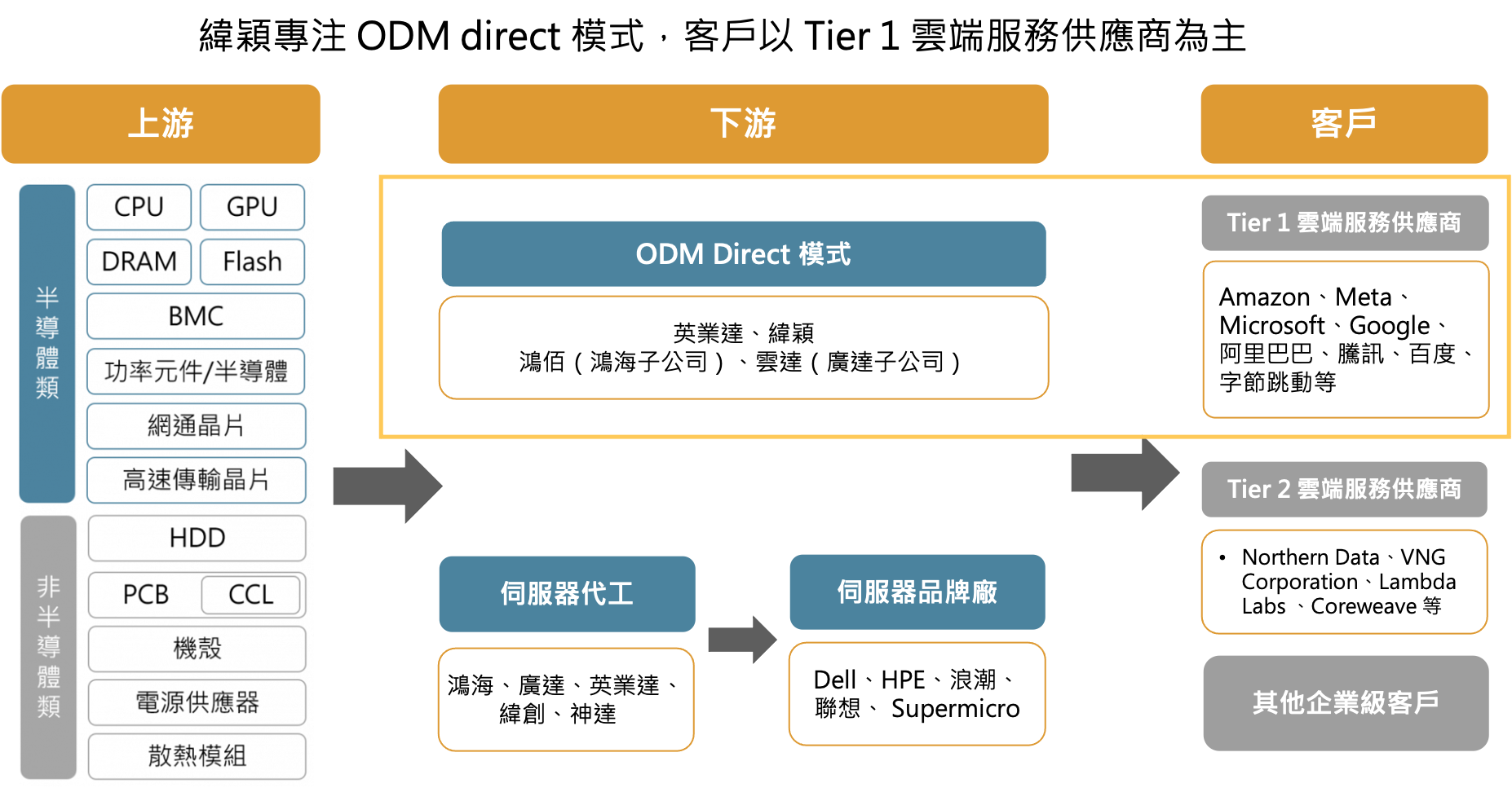緯穎(市:6669)於 2012 年自 緯創(市:3231)拆分,拆分後,由緯創負責承接品牌廠商的代工訂單(傳統伺服器代工模式),而緯穎則經營雲端服務供應商(Cloud Service Provider, CSP)的訂單(ODM direct),提供超大型資料中心(Hyperscale Data Center)客製化的伺服器系統整合解決方案。緯穎主要客戶以美國三大大型 CSP 廠商為主,其中 Meta 就佔營收近 50%,Microsoft 則佔 30%,Amazon 10%,因此看這三間公司的策略營運,就可大機率判斷緯穎的成長動能。
