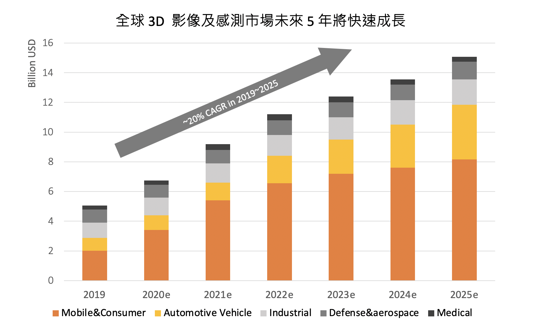 根據研調機構 Yole Développement 研究指出,全球 3D 影像及感測市場將由 2019 年的 50 億美元成長到 2025 年的 150 億美元,CAGR 超過 20%,其中又以智慧型手機及車用為主要應用,在 2025 年市場規模分別可達到 81 億美元及 37 億美元,兩者合計份額達 80%, CAGR 分別達 26% 及 28%。除了表示 3D 感測未來的成長潛力,也顯示消費端的需求增加是帶動這波趨勢成長的關鍵。