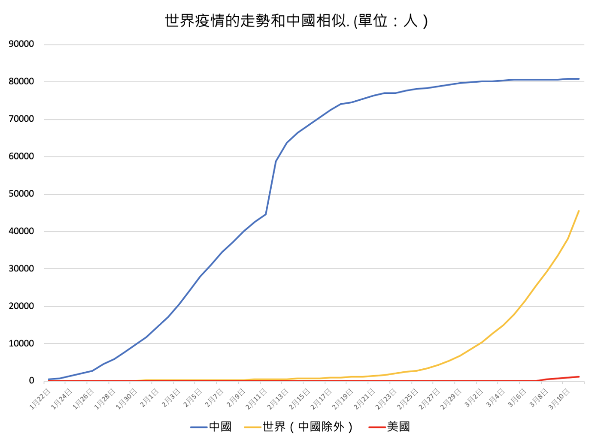 由圖可以看到中國由疫情爆發到高速成長的頂峰期約為一個月,然後政府強勢介入後逐漸趨緩,現在疫情往歐洲及美國蔓延,進入高速成長。也可以發現中國以外的案例數發展至今日為止都與中國本地的人數走勢很相近,同時間美國還在起步階段。