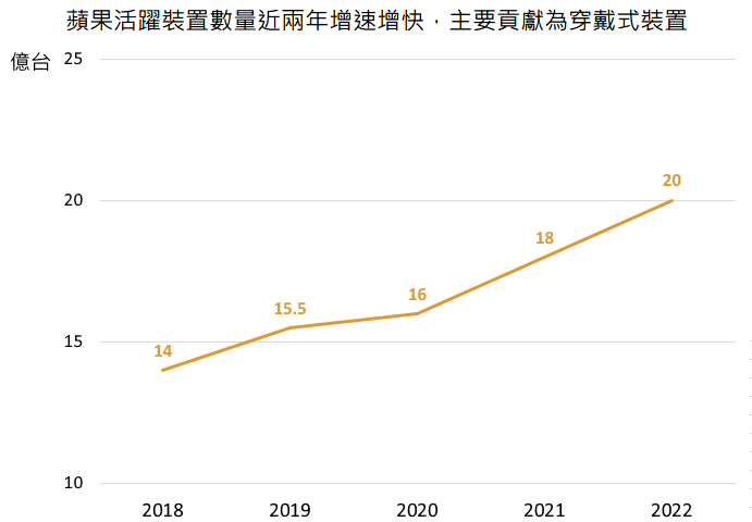 目前蘋果全球活躍裝置數已超過 20 億台,YoY+11.1%,在近兩年明顯加速,判斷因生態系完善,越來越多用戶願意購買更多的蘋果產品,這樣龐大的用戶基數將有利公司未來在軟體服務上的導流。