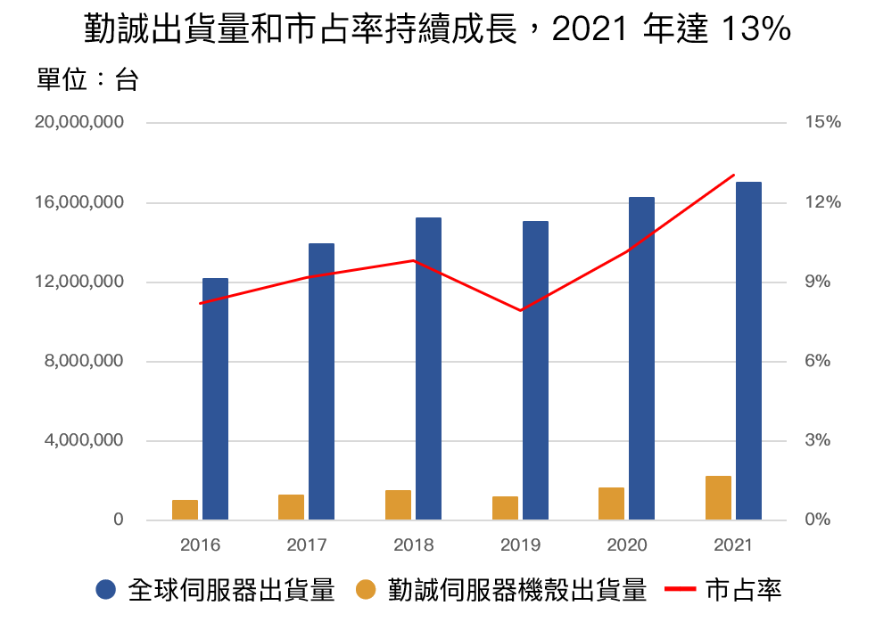 勤誠產品以目前市場主流的直立式、機架式伺服器機殼為主,且針對邊緣運算、高密度儲存、 AI 運算等不同場景都有推出相對應的規格,整體出貨狀況隨全球伺服器出貨量增加持續成長,市占率持續攀升,2021 年達 13%。