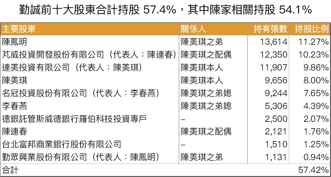 勤誠由現任董事長陳美琪與丈夫陳連春、弟弟陳鳳明共同創辦,總經理則為原全球行銷業務處副理陳亞男,其餘經營團隊也多具電子製造業經歷。