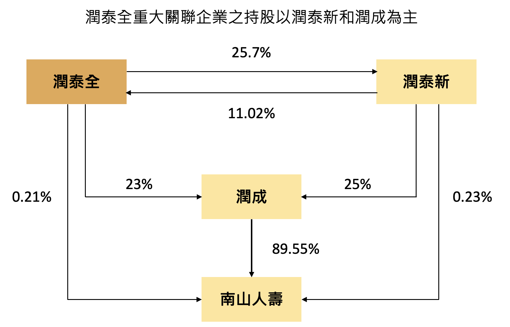 雖然南山人壽直接貢獻給潤泰全之收入只佔營業外收支約 0.8%,但經過下表計算其交叉持股比例,潤泰全直間接持有南山人壽 26.62% 之股權。從下方之股權結構圖中更可以看出,貢獻給潤泰全營業外收支最大佔比之潤成投控,持有南山人壽將近 90%,受南山人壽影響甚巨,可間接看出南山人壽對於潤泰全之影響力。