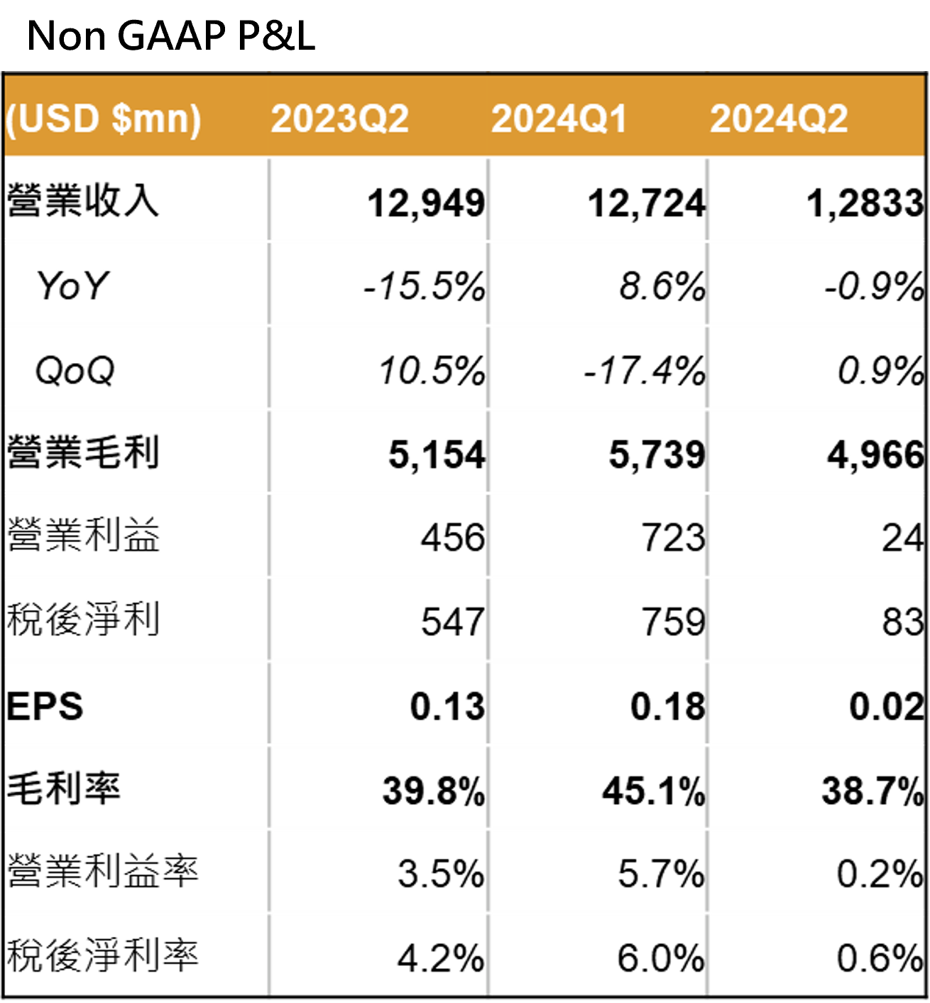 Intel 2024Q2 營收為 128 億美元(以下同),YoY -1%、QoQ +1%,毛利率 38.7%,遠低於市場預期的 43.5%,EPS 0.02 元。毛利率降低主因毛利較低的 AI PC 處理器 Core Ultra 出貨量增加,同時在加速將產能從奧勒岡廠轉移至晶圓成本較高的愛爾蘭廠(毛利率將下滑 4%),故造成本季獲利衰退。