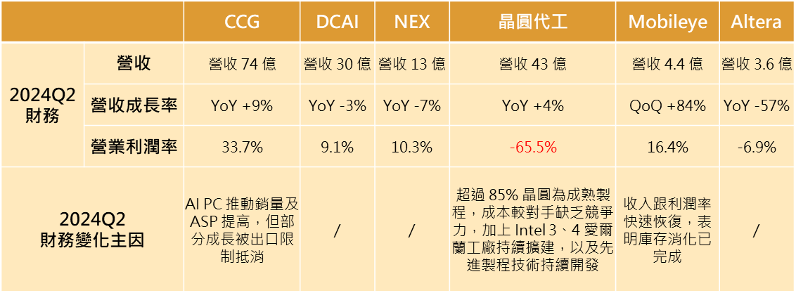再就各部門進行分析,可將 Intel 拆分成 CCG(Client Computing Group:客戶運算)、DCAI(Data Center and AI:數據中心和人工智慧)、NEX(Network and Edge:網路和邊緣)、晶圓代工、Mobileye(自駕系統公司)跟 Altera(FPGA 公司)六個區塊: