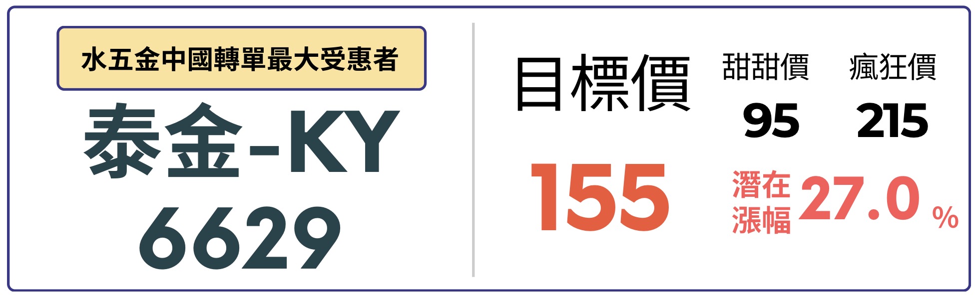 美中貿易戰加徵關稅促使原於中國生產之家飾件及水五金產品外移,泰金來自中國轉單持續增加,營運將顯著成長。