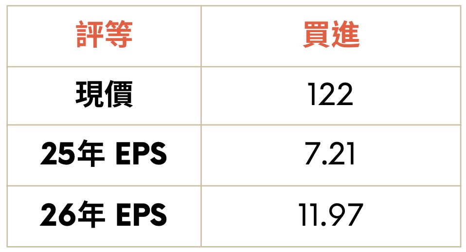 預估 2026 EPS YoY+66.02%,訂單把握度高,給予買進評等,目標價 155 元 (13 X 2026 EPS)。