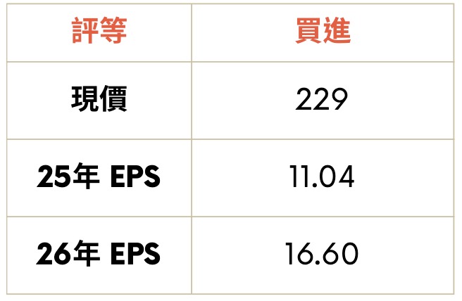 隨高階 AI 伺服器逐漸放量,不僅漲價循環開啟,更拉升了 MLCC 以及鉭質電容的需求量。身為鉭質電容市佔第一、被動元件市佔前五的龍頭,此動能將 國巨 帶來突破性的成長。預估 2026 全年營收可來到 1,681 億元,年營收成長 29.1%,EPS 達 16.6 元,我們參考過去區間本益比 (12-19X) 給予區間高 18 倍評價,目標價 300 元。