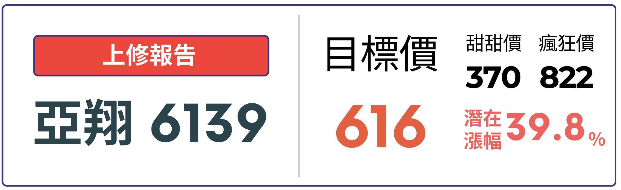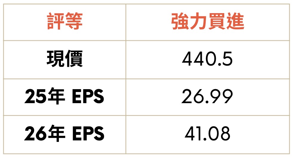 Q3 合約負債續創歷史新高,2H25 進入認列高峰,隨著台積電海內外擴廠,亞翔積極爭取相關訂單,加上記憶體大廠持續擴充 HBM 產能,有利海外訂單維持,26 年有望每季賺 10 元。目前本益比僅 11 倍,成長即將爆發,評價明顯低估,按 26 年 EPS 41.08 元給予合理評價 15 倍,目標價 616 元。