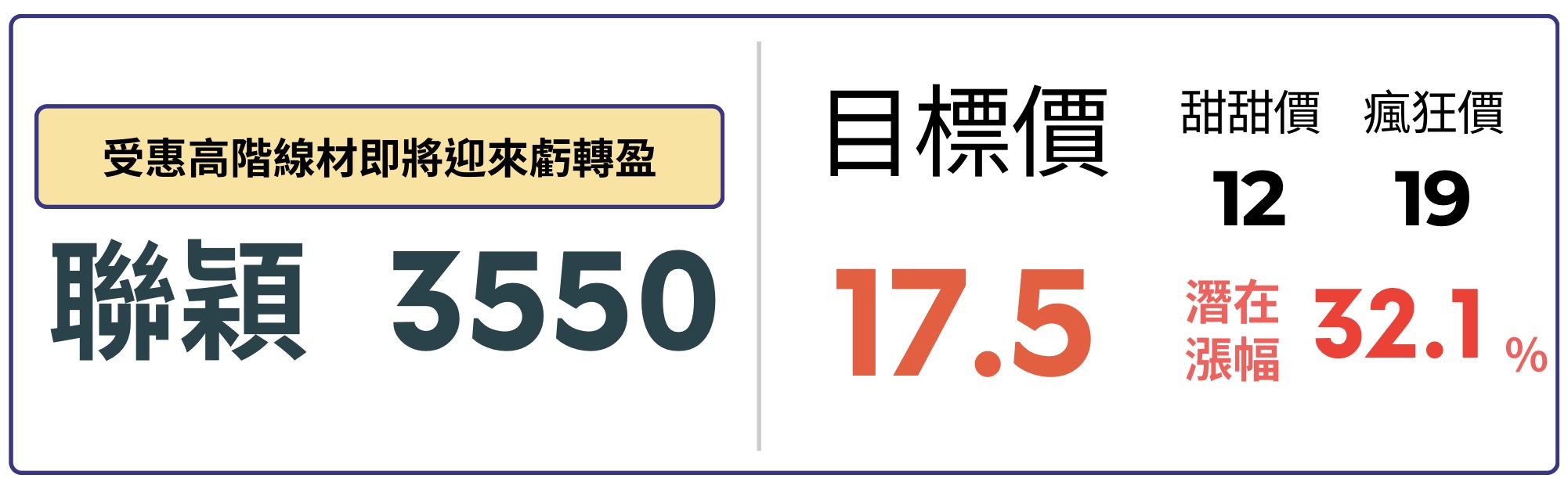 聯穎過去幾年因為大陸政府政策而遷廠,期間承受龐大資遣費以及遷廠損失導致虧損。但隨著折舊已於今年認列完成,明年隨著新廠稼動率提升、動線與設備到位以及新產品推出,營運將走出谷底,預估 2026 年營收可來到 40.7 億元,年營收成長 17%,每股淨值將成長 4.4% 來到 14.60 元。我們參考過去 4 年本淨比區間 (0.6-1.5X) 給予區間中上段 1.2 倍評價,目標價 17.5 元。