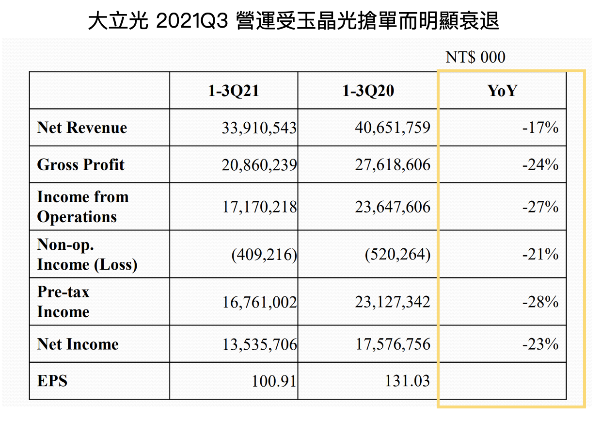 衰退主因為手機部分零組件如 PMIC(電源控制 IC)、CIS(影像感測元件) 、 AP(處理器晶片)仍在缺貨,而鏡頭因屬於長料(較不缺),導致部分高階訂單將延遲到 2022 年。加上此次 iPhone 13 玉晶光的搶單,都將使公司 Q4 的營運更不樂觀。