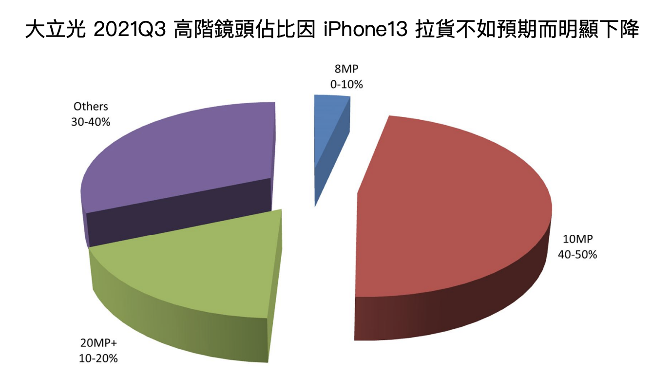 高階鏡頭佔比(1,000 萬畫素以上)由 2021Q2 的 70~90% 明顯降低至 50~70%,主要原因為大客戶蘋果本次推出的 iPhone 13 最高規格仍只有採用 7P 鏡頭,且蘋果為了降低對單一供應商的依賴,加大競爭對手玉晶光的供貨比例,而導致大立光高階鏡頭訂單減少。
