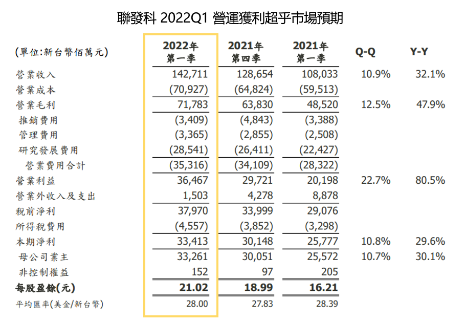 2. 展望 2022Q2,預估營收將為 1,470~1,570 億元(匯率為美元兌新台幣 1:28.5),YoY+17~25%,QoQ+3~10%;毛利率預估為 47.5~50.5%,較 Q1 下降主要因反映晶圓代工漲價及存貨成本上升;營業費用率則預估為 22-26%。