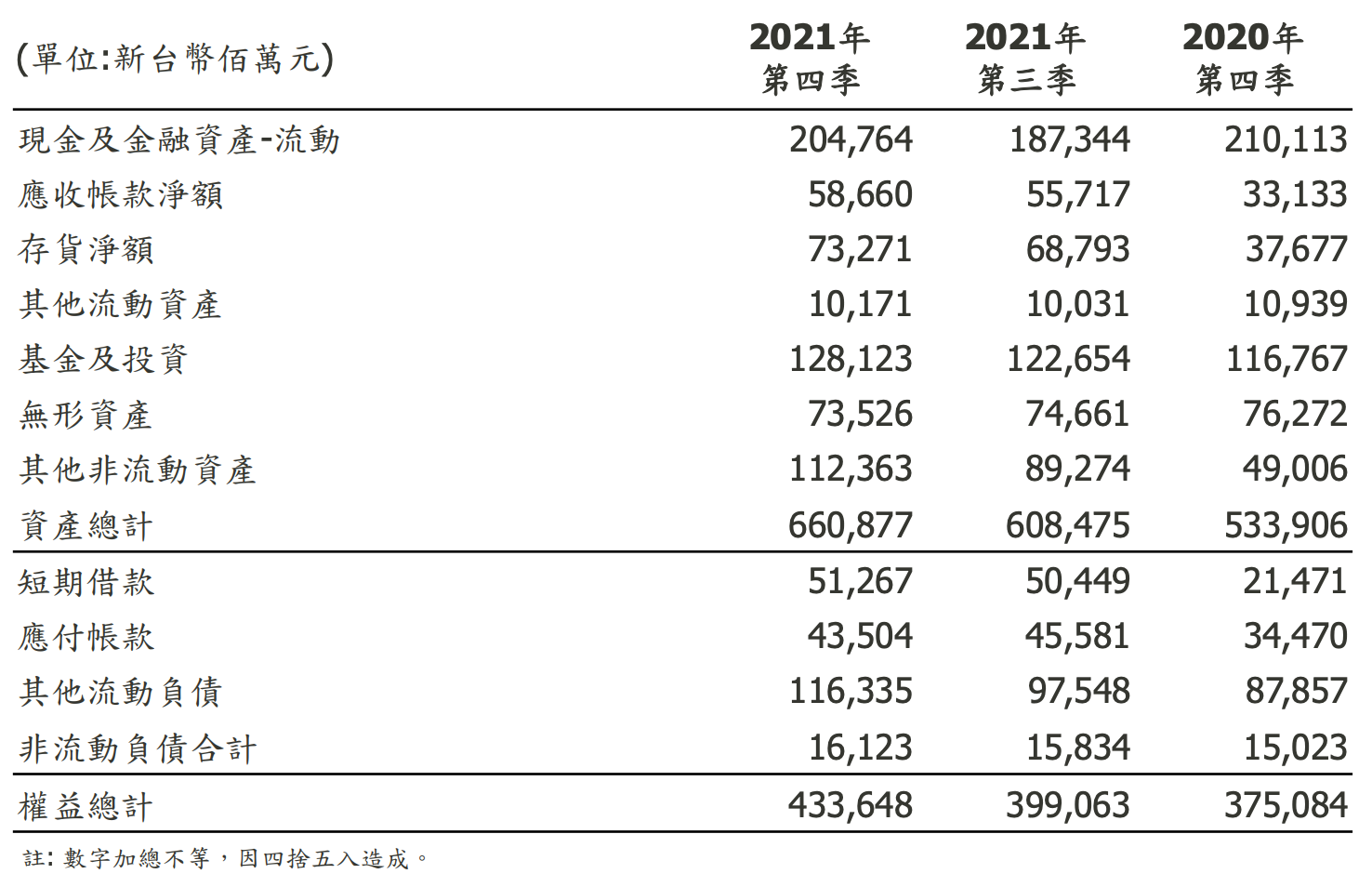 4. 聯發科 2021Q4 帳上現金為 1,837.1 億元(若包含現金等價物、金融資產則為 2,047.6 億元),佔總資產 31.0%,整體現金水位充足。