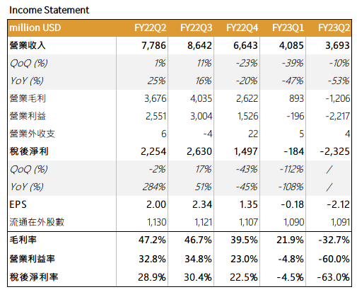 營收 36.9 億美元(以下同),QoQ-9.6%、YoY-52.6%,位於財測 36~40 億元下緣;毛利率 -32.7%,QoQ-10.8ppts、YoY-79.9ppts,低於財測 6.0~11.0%;EPS -2.12 元,QoQ-1.96 元、YoY-4.12 元,低於財測 -0.52~-0.72 元,並創下歷史新低。本季陷入虧損主因認列 14.3 億元庫存減損。