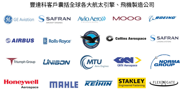 豐達科成立於 1997 年,由美國航太扣件製造商 AVIBANK 與台灣神基(市:3005)共同創立,主要生產航太級的金屬扣件,產品用於飛機引擎、起落架等系統。累計 2022 年前三季營收佔比為航太扣件 53%、航太車削件 29%、工業扣件 18%,其中航太扣件全球僅豐達科、Arconic(Howmet Aerospace)、PCC、LISI 等四家公司通過驗證可合格供應,客戶則包含全球前四大航太引擎製造商 CFM、GE、普惠、Rolls-Royce。