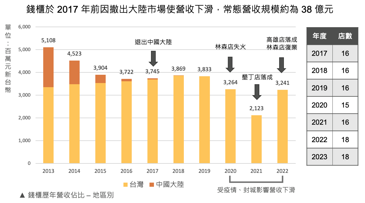 錢櫃於 2013~2017 年營收衰退主因為逐步撤出中國大陸事業。觀察 2017 年後之營運概況,撇除受疫情影響的 2020、2021 年,營收規模落於 37~39 億元新台幣(以下同),平均單店營收約落於 2.3~2.4 億元。