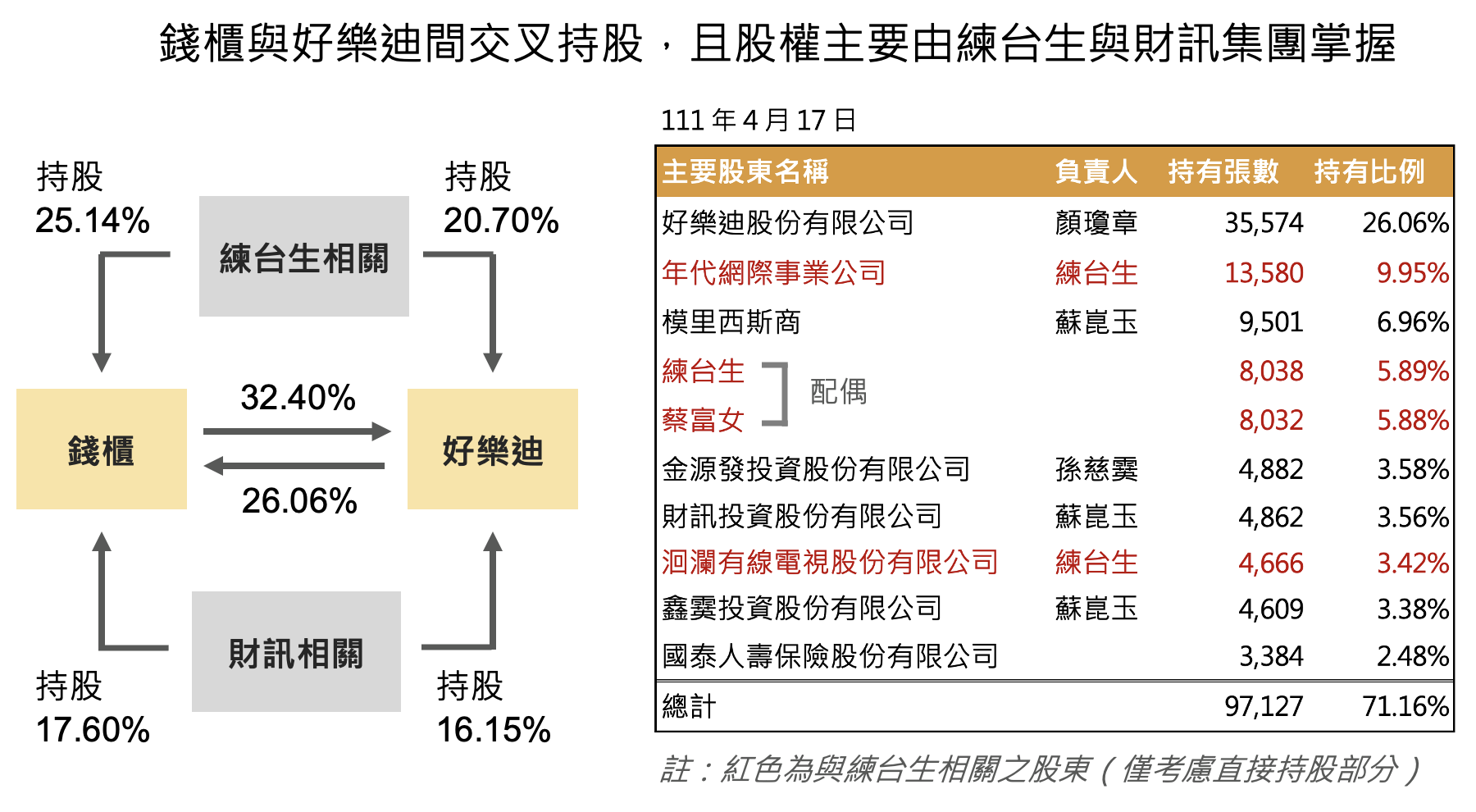 錢櫃自 2012 年登錄興櫃以來,股權主要由公司派持有。此外,早在 2002 年好樂迪(市:9943)與錢櫃即因戰略合作而交叉持股,後隨好樂迪創辦人淡出經營層,其股權便由錢櫃現任董事長暨執行長練台生承接。