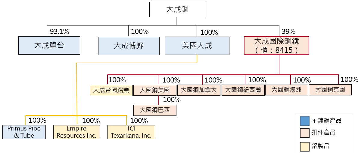 公司產品以外銷美國(佔比約 92%)為主,在美國 100% 持有子公司 Ta Chen International Inc(美國大成),成立逾 30 年,為美國第一大鋼鐵通路商,市佔率達 30%,且公司販售之不銹鋼為全美四大供應商之一。