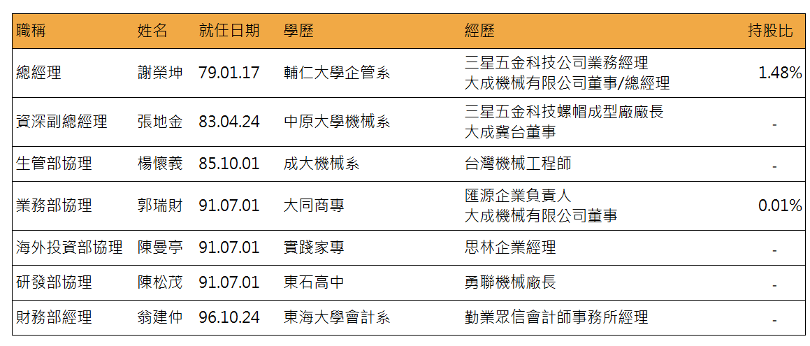 經營層方面,創辦人兼總經理謝榮坤從銷售扣件業務(三星五金公司,全球最大的鋼鐵螺帽專業製造廠)起家,有約 40 年國外銷售經驗,深耕美國市場。其餘管理層在大成鋼工作多年,也有豐富的技術背景。