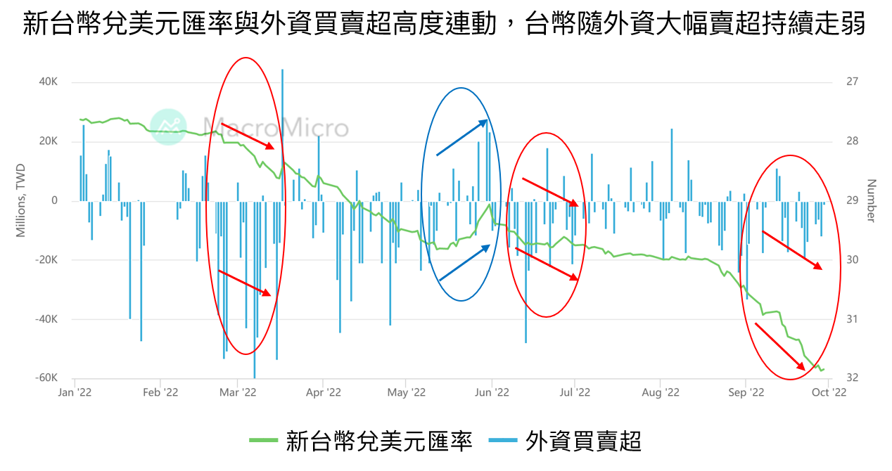 從外資台股買賣超與新台幣兌美元匯率走勢對比,也能看出外資大幅賣超與匯率的關係,在大幅賣超並匯回美元下,使台北外匯市場的美元供不應求,造成台幣進一步貶值。