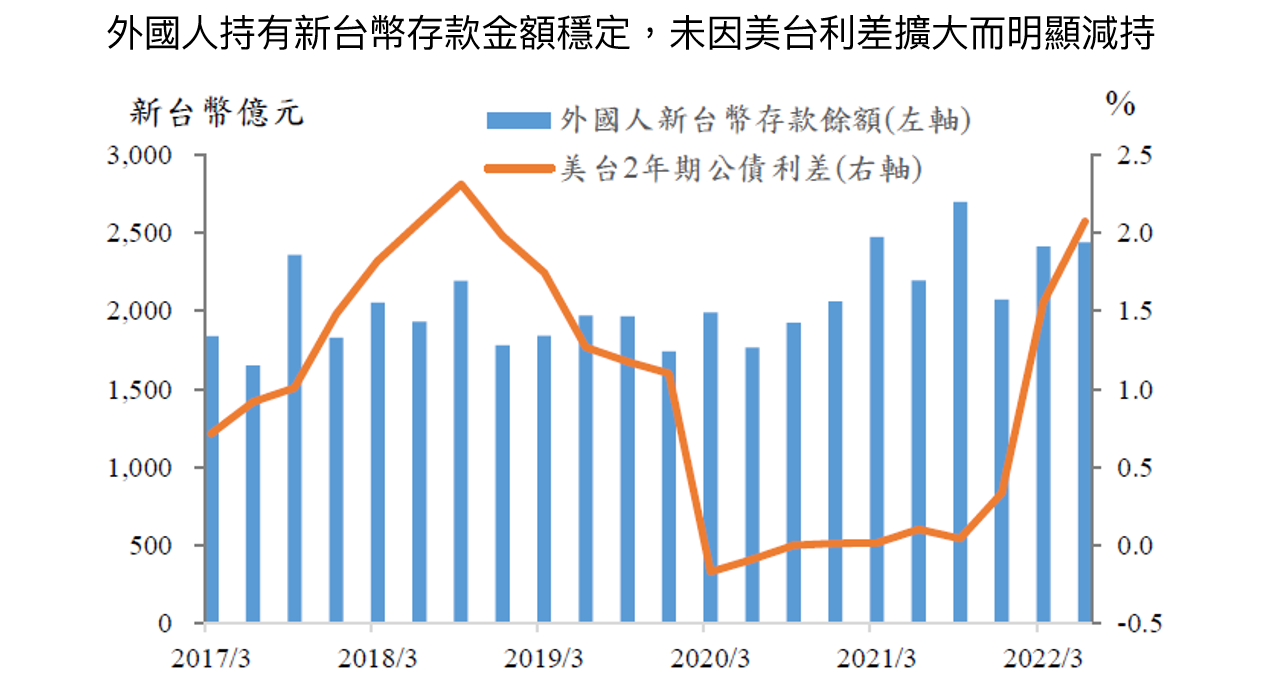 聯準會(Fed)自 2022/3 月起,為抑制高通膨而加速緊縮貨幣,使兩年期美國公債殖利率從三月約 1.3% 攀升到目前約 4.2%,台美利差也隨之擴大。然觀察外資的新台幣存款部位無明顯減少(仍保留其活期及定期存款),並無資本大量撤出的狀況。