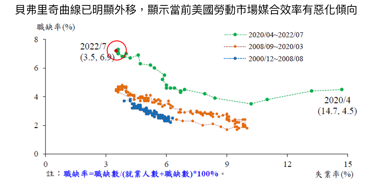 然而,根據美國智庫 PIIE 和 Brookings Institution 研究指出,由於貝弗里奇曲線已明顯外移(表示市場媒合效率有惡化的傾向),若根據歷史資料試算,職缺率下降至疫情前水準時, 失業率必大幅上升,估計失業率將提升至 6-7.5%,實現經濟軟著陸機率非常低。