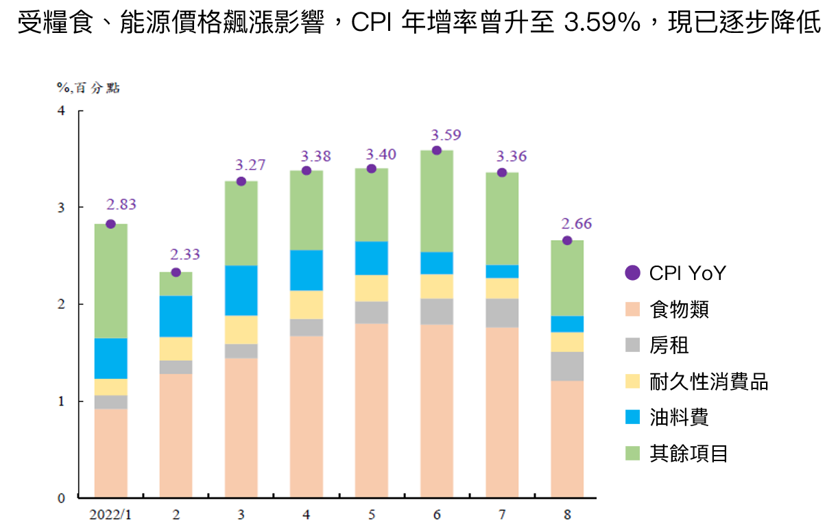 相較於歐美地區高達 8% 以上的 CPI 年增率,台灣僅在 6 月時受糧食、能源價格的飆漲影響,CPI 年增率一度升至 3.59%,但近期價格逐漸回穩下,8 月 CPI 年增率已回降至 2.66%,同美國已自高點出現反轉。