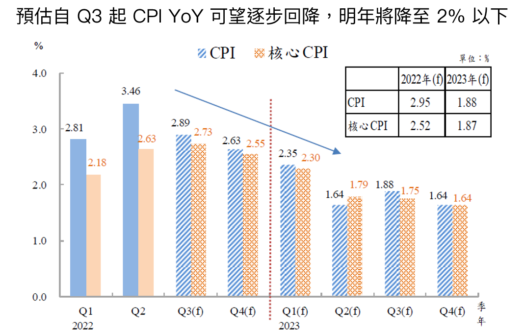 展望下半年及 2023 年,預期在國際原油(美國 EIA 預測油價將自 2022Q3 起逐漸往下)、糧食(聯合國糧農組織制定的食品價格指數已連續五個月下降)等價格的回跌,以及比較基期墊高下,台灣通膨可望持續趨緩,央行估計 2022 年及 2023 年 CPI 年增率將分別達 2.95% 和 1.88%。