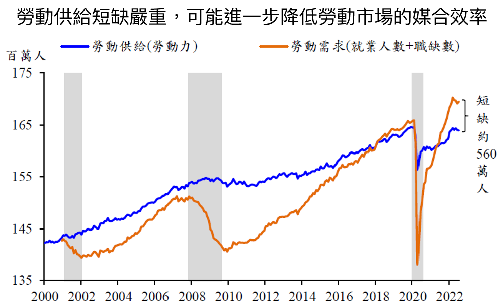 目前美國勞動市場因長新冠問題、戰後嬰兒潮世代之勞動力持續退休、嚴格之移民政策尚未鬆綁等因素,未來勞動供給短缺嚴重,使得勞工議價能力上升,加上包含高接觸風險(如休閒業、零售業等)、學用落差(如製造業回流美國,但美國社會長期以服務業為就業主流)等原因可能使職缺媒合更加困難。