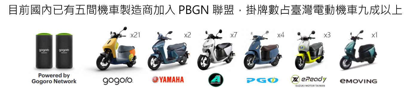 透過提供合作夥伴電動機車的開發套件,讓他們能快速推出電動機車並且共用換電系統的電池,如此一來 Gogoro Network 的訂閱用戶基數就能快速發展。目前全台路上 95% 以上的電動機車都為 PBGN 聯盟車款,可說公司的戰略在台灣已經成功。