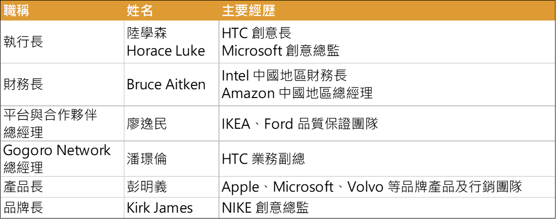 Gogoro 經營團隊具備豐富的科技業經歷。負責拓展海外 Gogoro Network 營運的潘璟倫總經理,過往曾成功帶領 HTC 開發歐洲市場業務,而其餘產品經營團隊成員也大多具備海外銷售經驗,對公司接下來往海外發展和佈局具正面影響。