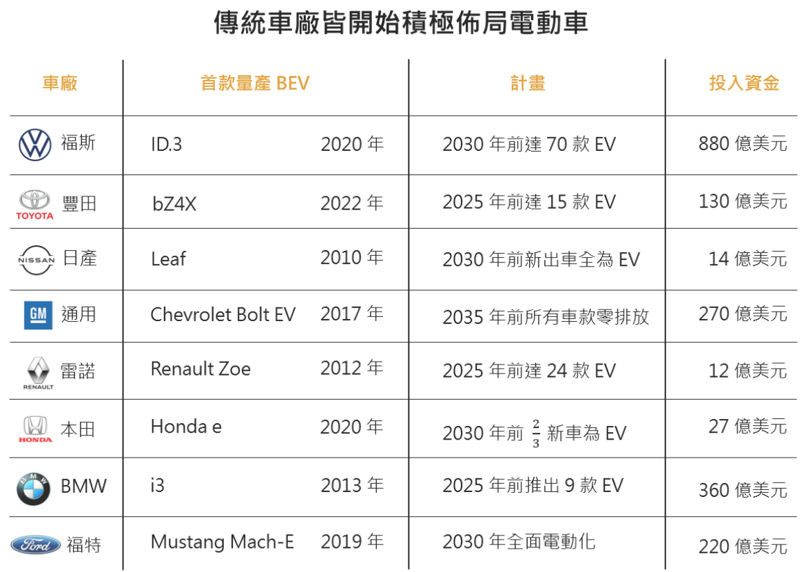 車廠方面,除了 Tesla、蔚來、小鵬等純電動車廠外,傳統車廠如福特、福斯、BMW 甚至日本的豐田、本田等都在加速推出電動車,且車款也從高階款涵蓋到平價款。而科技廠商如小米、蘋果也都開始發展電動車業務,皆說明電動車已成為車廠們下一個角逐趨勢。