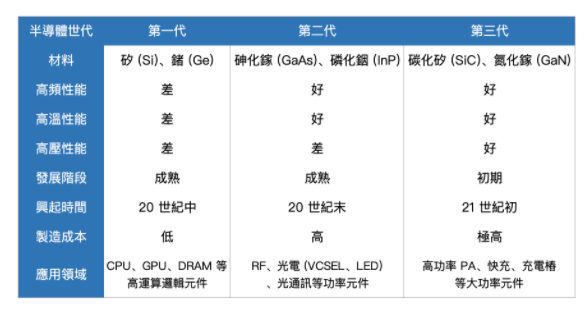 目前半導體材料共經歷三個發展階段,分別是第一代半導體的矽(Si)、鍺(Ge),第二代的砷化鎵(GaAs)、磷化銦(InP),以及第三代的碳化矽(SiC)、氮化鎵(GaN)。