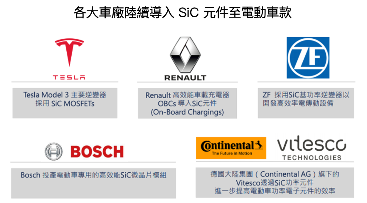 目前 SiC 的模組價格為 IGBT 的 10~15 倍,但因其效能優勢,各大車廠為保持競爭力仍在加速導入 SiC,例如 Tesla 率先在 Model 3 導入 SiC 逆變器,並沿用到 Model S、Model X;而 BOSCH、比亞迪、蔚來、Honda、Nissan 也都陸續在逆變器、車充模組導入,再次證明 SiC 已成為電動車戰場的關鍵材料 。