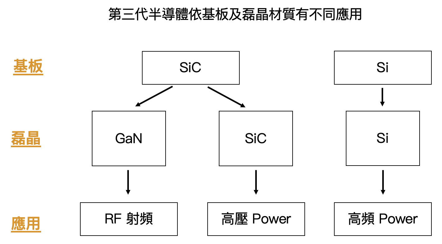 而 GaN on SiC 雖品質較佳,但因 SiC 技術難度高使整體成本較高,目前仍在發展階段。不過因 SiC 基板的特性,使其適合用在如基地台、航太等高頻的 RF 領域。