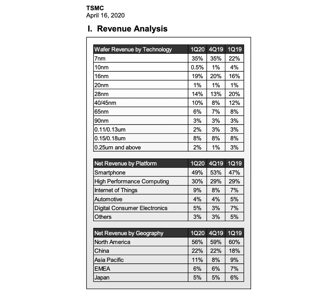 5奈米 :目前在 Ramp up 階段(提升良率)。量產時間從原本的 2020Q2 延後到 Q3,反應了疫情導致智慧型手機需求疲軟,蘋果的 iPhone 12 將不會延期發布,但可能大幅降低備貨。預計全年 5 奈米仍可貢獻約台積電 10% 營收。