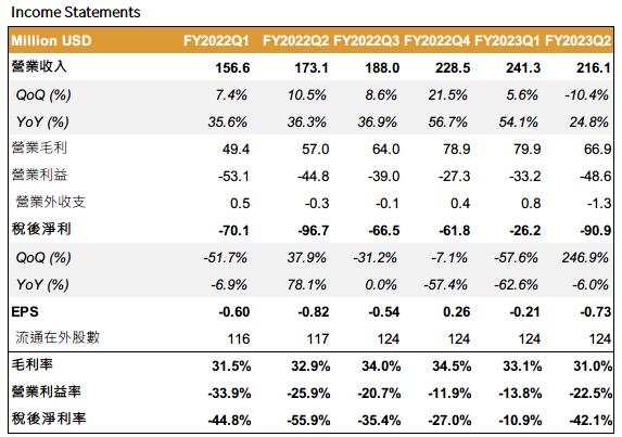公司 FY2023Q2 營收為 2.16 億美元(以下同),YoY+25%、QoQ-10%;毛利率 31.0%,YoY-1.9ppts、QoQ-2.1ppt;調整後 EPS 為 -0.73 元,YoY+0.09 元、QoQ-0.52 元,整體落於公司財測低標,但低於市場預期。